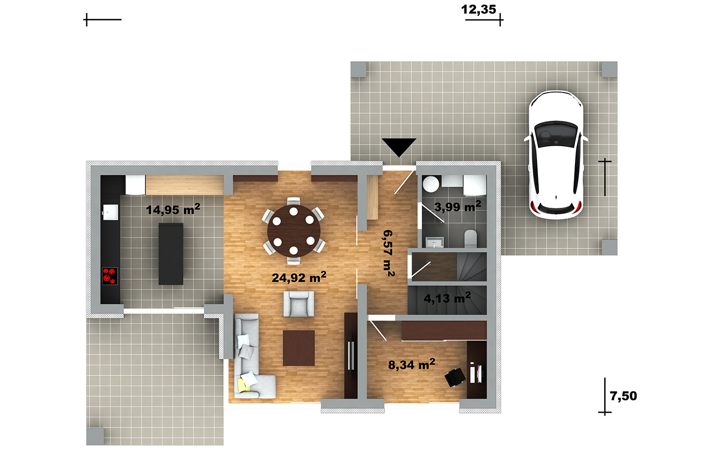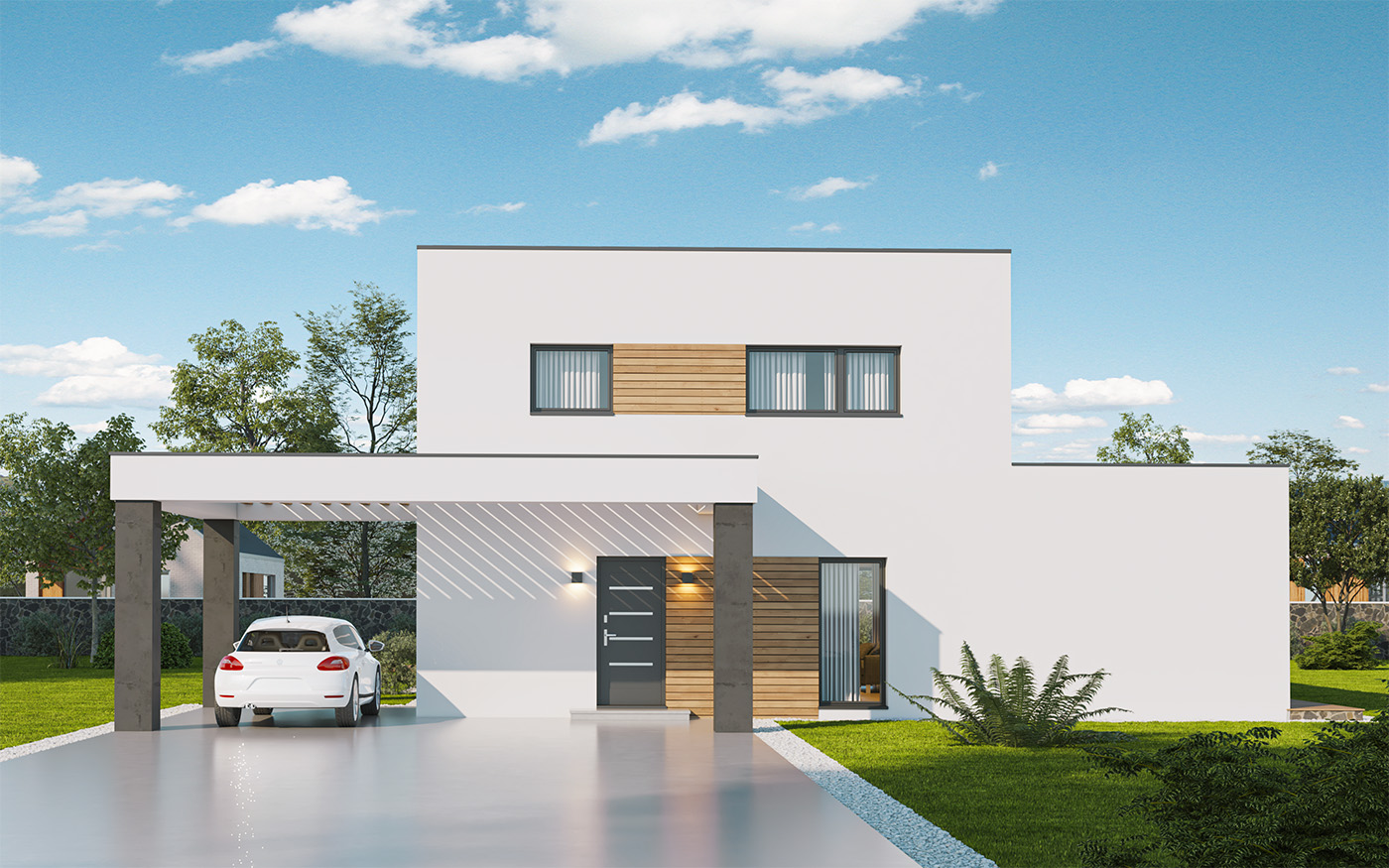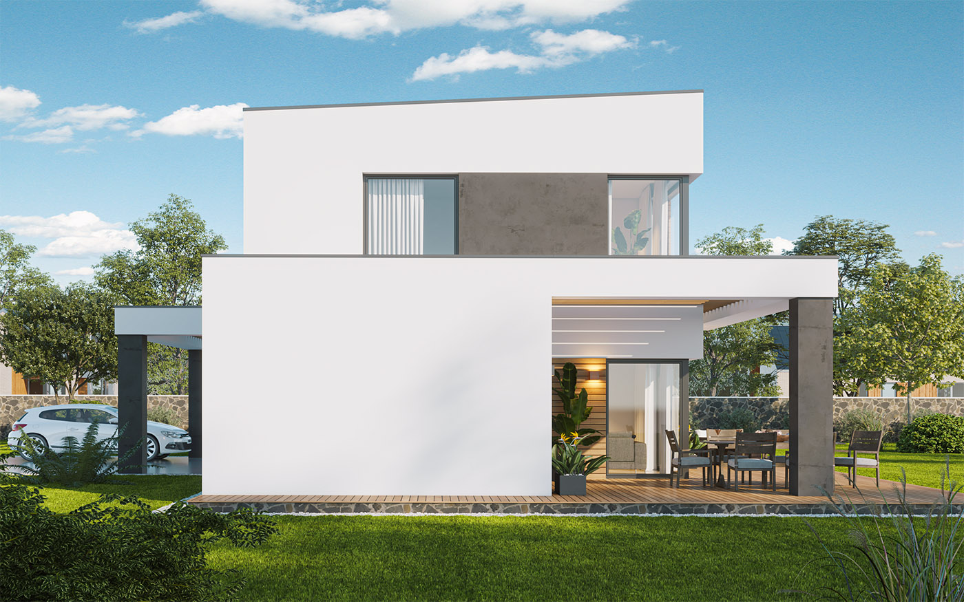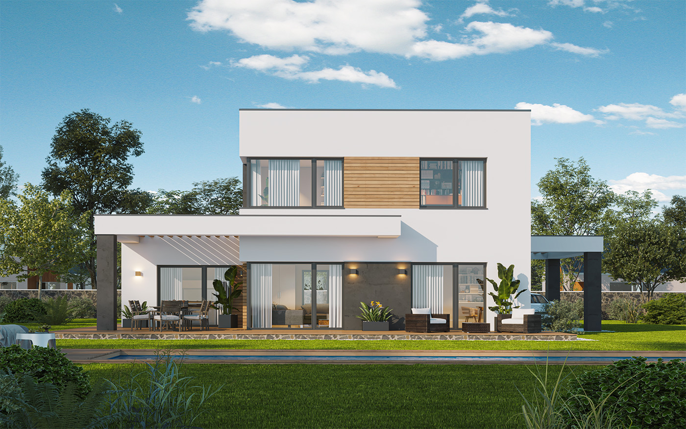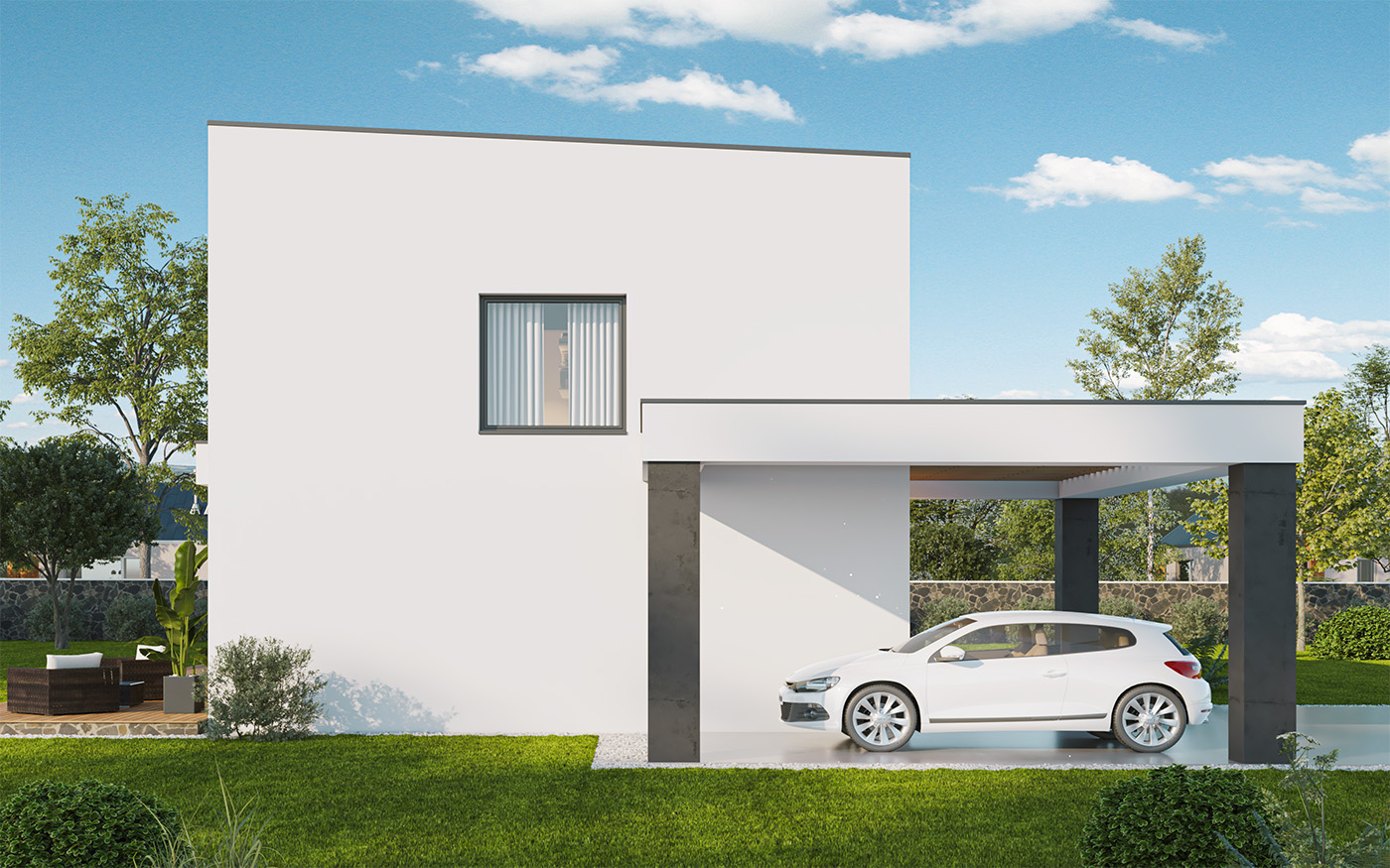 Powierzchnia zabudowy domu to 81,84 m2, pergola 19,21 m2, a zadaszony parking 33,3 m2. Dom ma bardzo nowoczesny wygląd z czystymi a jednocześnie strukturalnymi powierzchniami.
