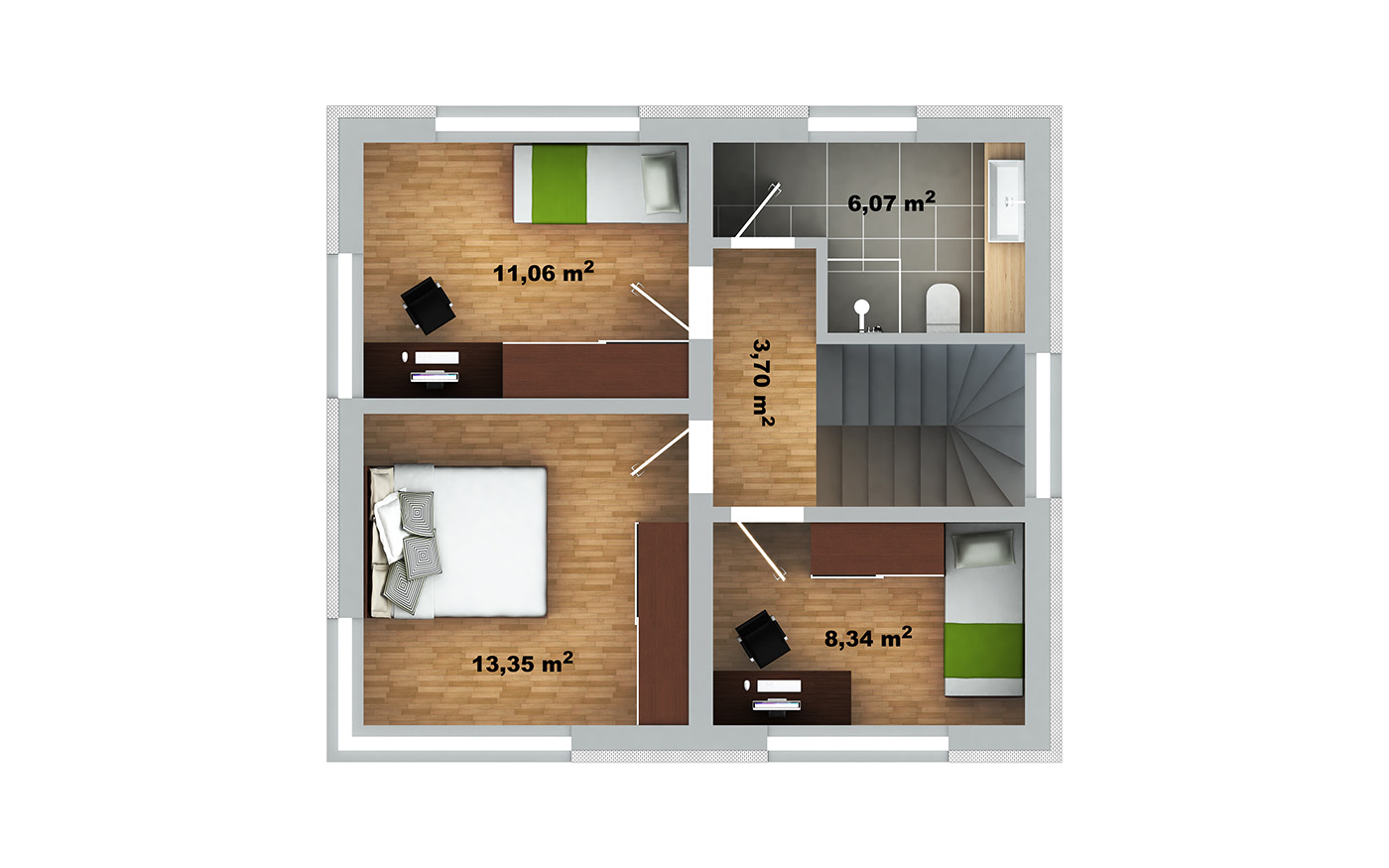 Dobrze rozplanowany układ zapewni wystarczająco dużo miejsca na rodzinne współżycie i wizyty. Drugie piętro zapewnia wtedy całkowitą prywatność każdemu z pokoi.
